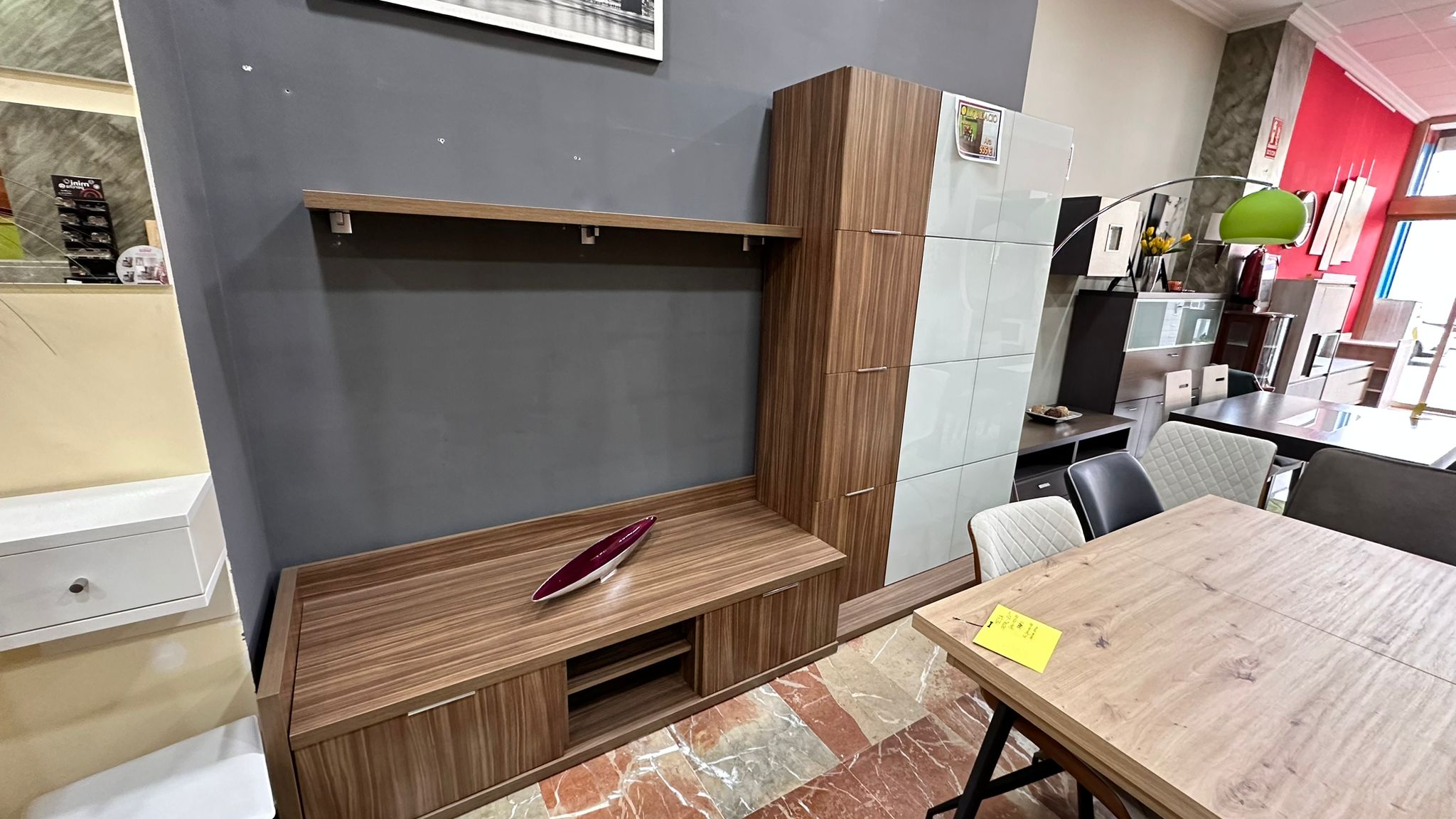Composición de comedor 304cm. con mod. TV 169cm + mod. 135x 207 alto. Color Nogal + cristal lacado.