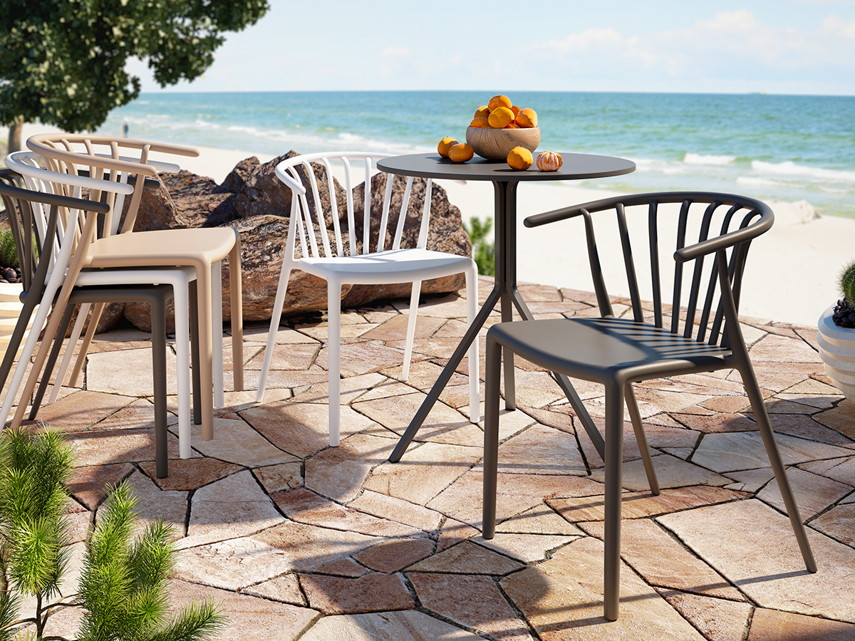 Silla apilable de polipropileno en tres acabados diferentes. Apta para uso en exteriores.